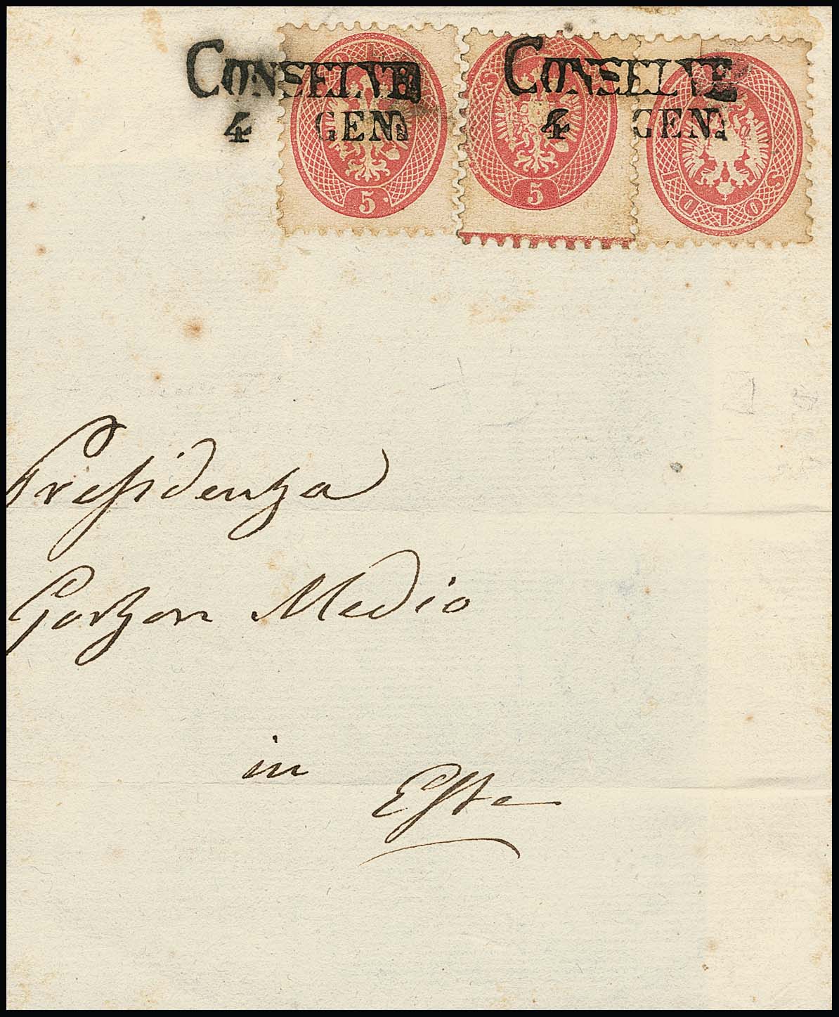 5 Sld. rosa per drei (mittlere Marke unten mit deutlichem Lötgrad) auf großem Briefstück mit L2 "Conselve", Müller 84a