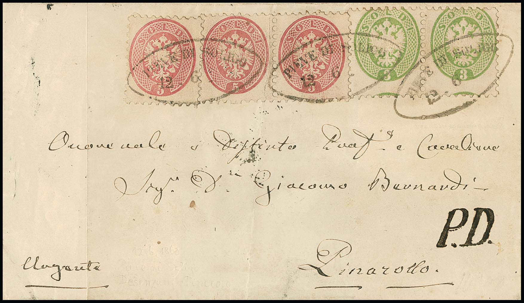 3 Sld. gelbgrün, Prachtpaar, nebst dreimal 5 Sld. rosa (einmal mit Vorfaltspur aufgeklebt) auf Auslandscouvert mit Ovalstempel "Pievedi Soligo" nach Pinarolo, Müller 186b