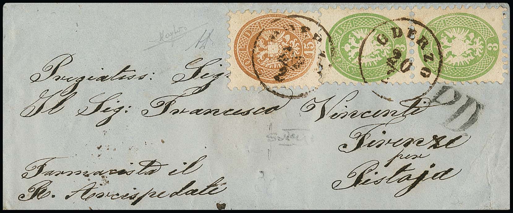 3 Sld. gelbgrün im senkrechten Paar, nebst 15 Sld. gelbbraun, auf Prachtcouvert 1866 mit K1 "Oderzo" nach Florenz. Sign. Raybaudi, Diena und Sottoriva mit Attest