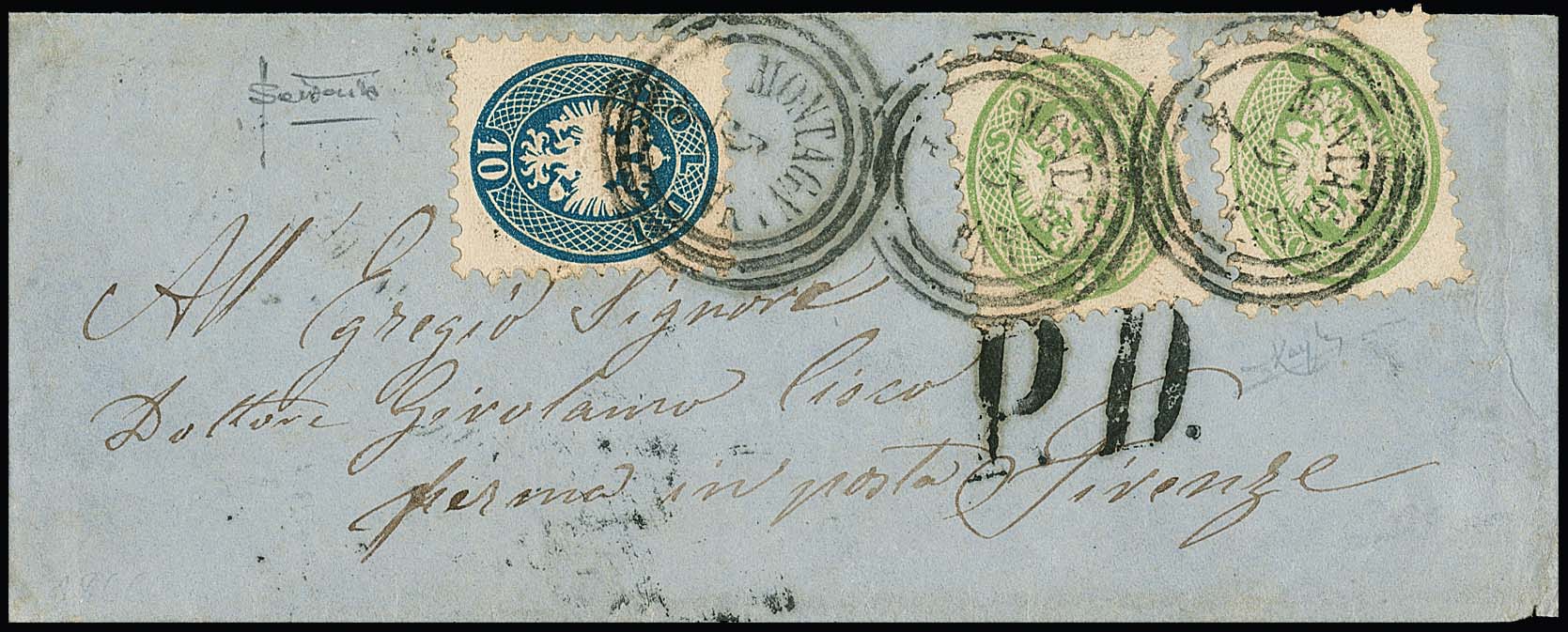 3 Sld. gelbgrün per zwei (eine etwas Randklebung), nebst 10 Sld. blau, auf Pracht-Damencouvert mit Dreiringstempel "Montagnana" nach Firenze, sign. Raybaudi, Sottoriva
