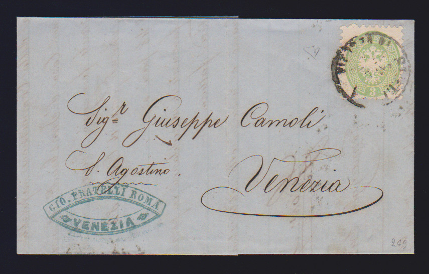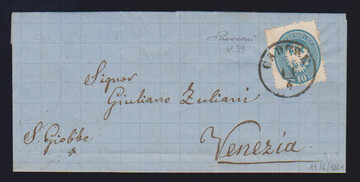 3 Sld. gelbgrün auf Prachtbrief mit K1 "Sta. Lucia in Venezia" im Nahbereich nach Venezia (rs. großer ovaler Distributionsstempel), ferner 10 Sld. blau auf Kabinettbrief mit K1 "Cadore", sign. Diena bzw. Vaccari