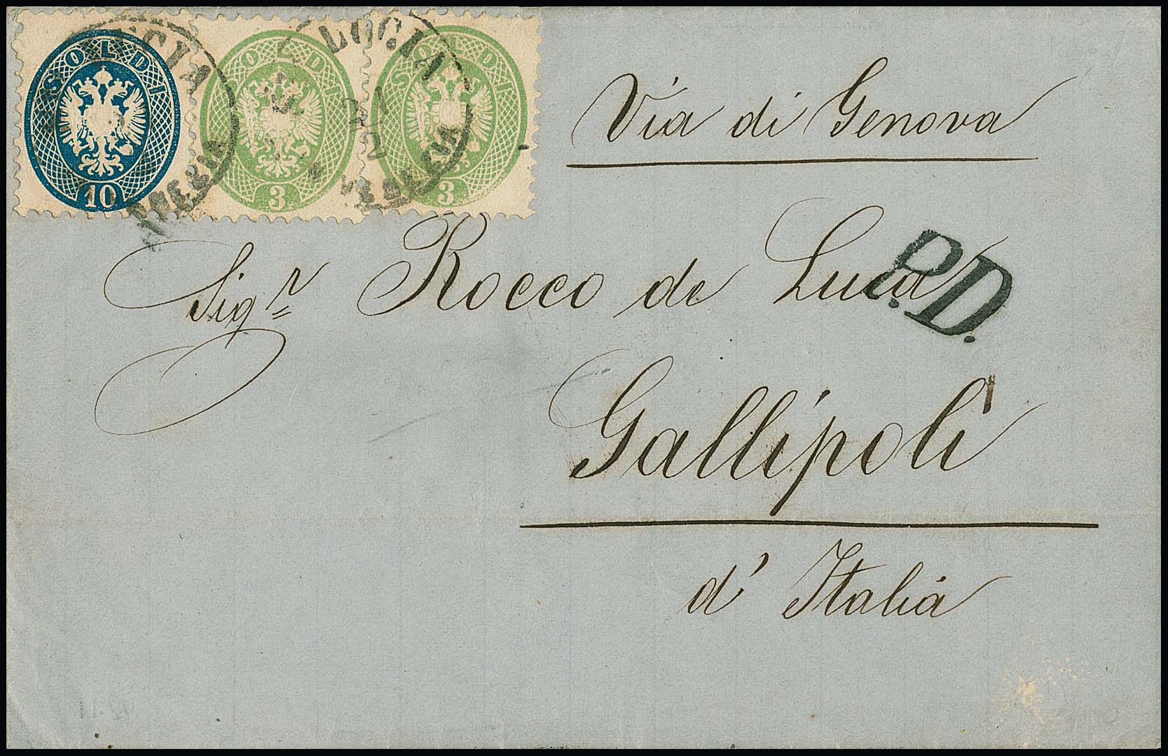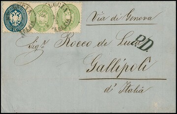 3 Sld. gelbgrün per zwei, nebst 10 Sld. blau auf Prachtbrief 1866 mit K1 "St. Lucia in Venezia" nach Gallipoli/Italien, via Genua. Müller 221b