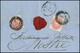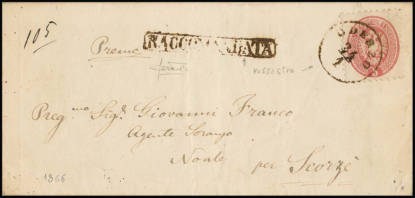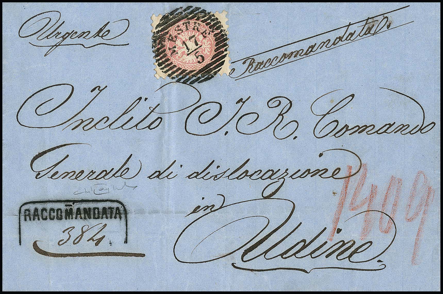 5 Sld. rosa, tadellose Einzelmarke vorder-, getrenntes Paar rückseitig, auf Einschreibebrief mit seltenem rostrotem K1 "Oderzo", auch der Neben-Reco-L1 in rostrot, Müller (Nr. 169b) in dieser Farbe nicht gelistet! Sign. Sottoriva