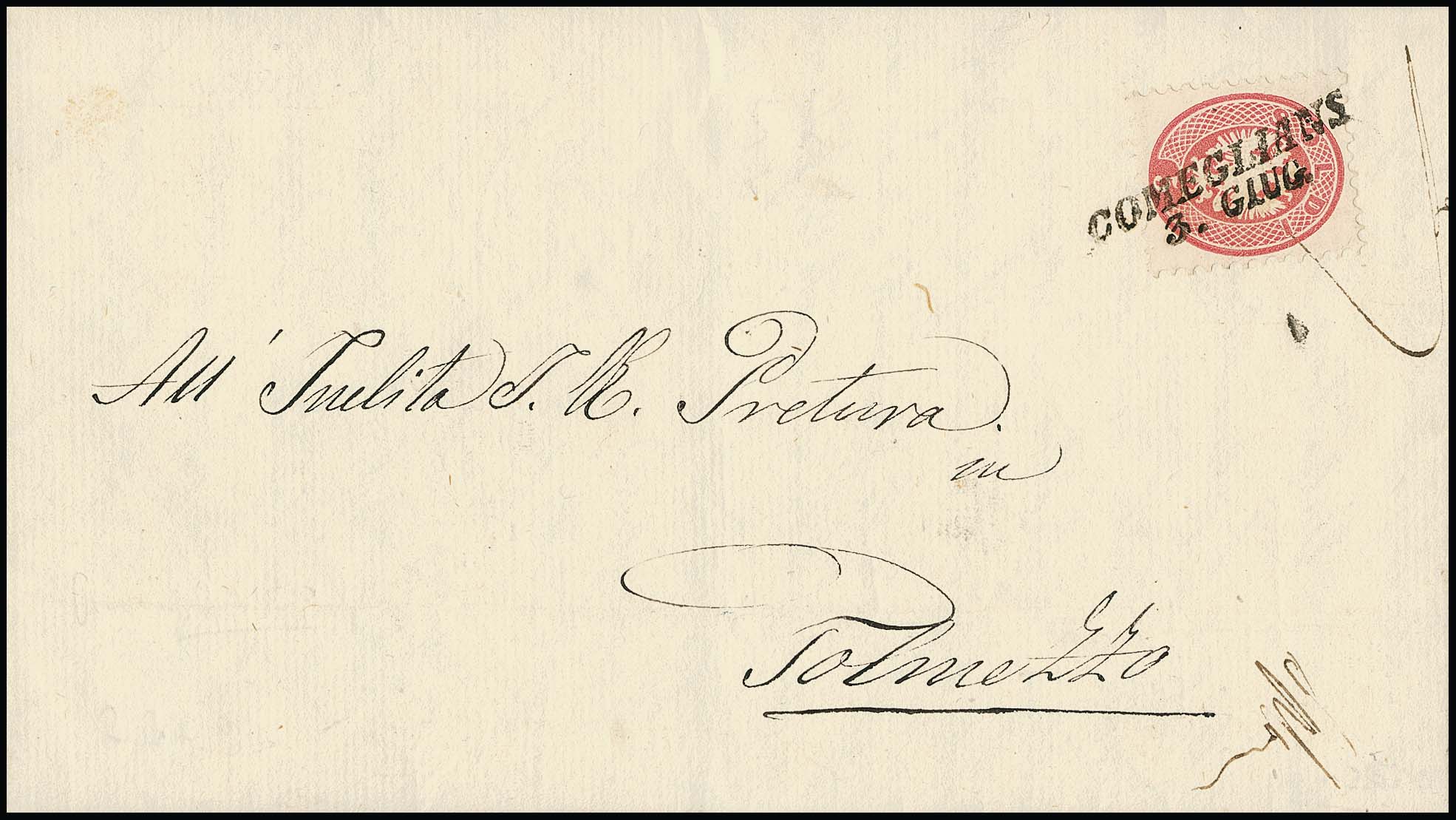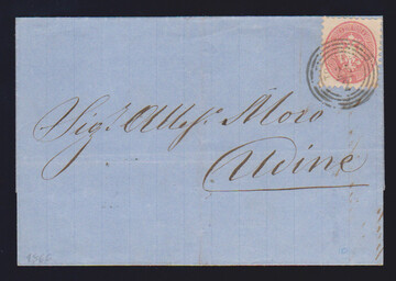 5 Sld. rosa auf Kabinettbrief mit sehr klarem, besserem L2 "Comeglians" (und kleinem Federzug) 1864 nach Tolmezzo