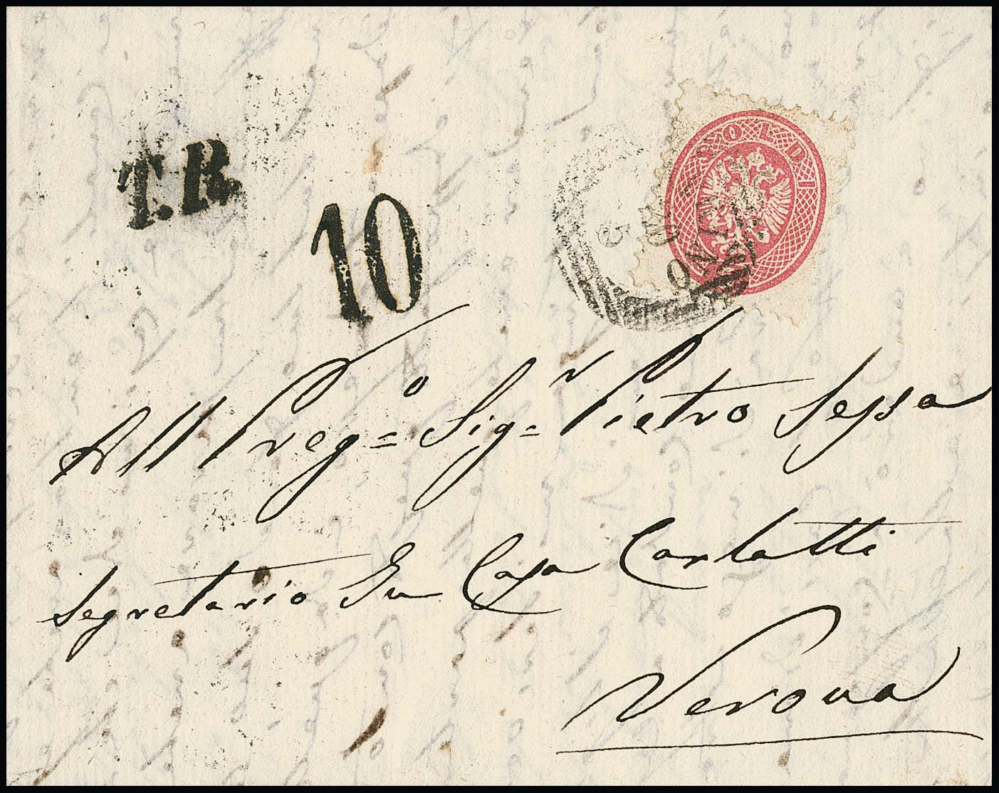 5 Sld. rosa auf Kabinettbrief mit Balken-Einkreiser "Caprino" und Neben-L1 "T.P." sowie Taxstempel "10" nach Verona, Müller 54b