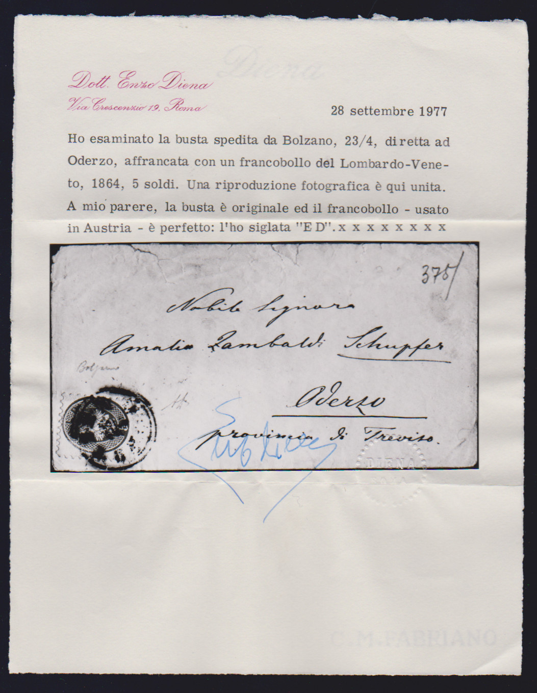 5 Sld. rosa, Prachtstück auf Couvert (oben kleine Öffnungsmgl.) mit seltenem K1 "Bozen" nach Oderzo. Attest Diena