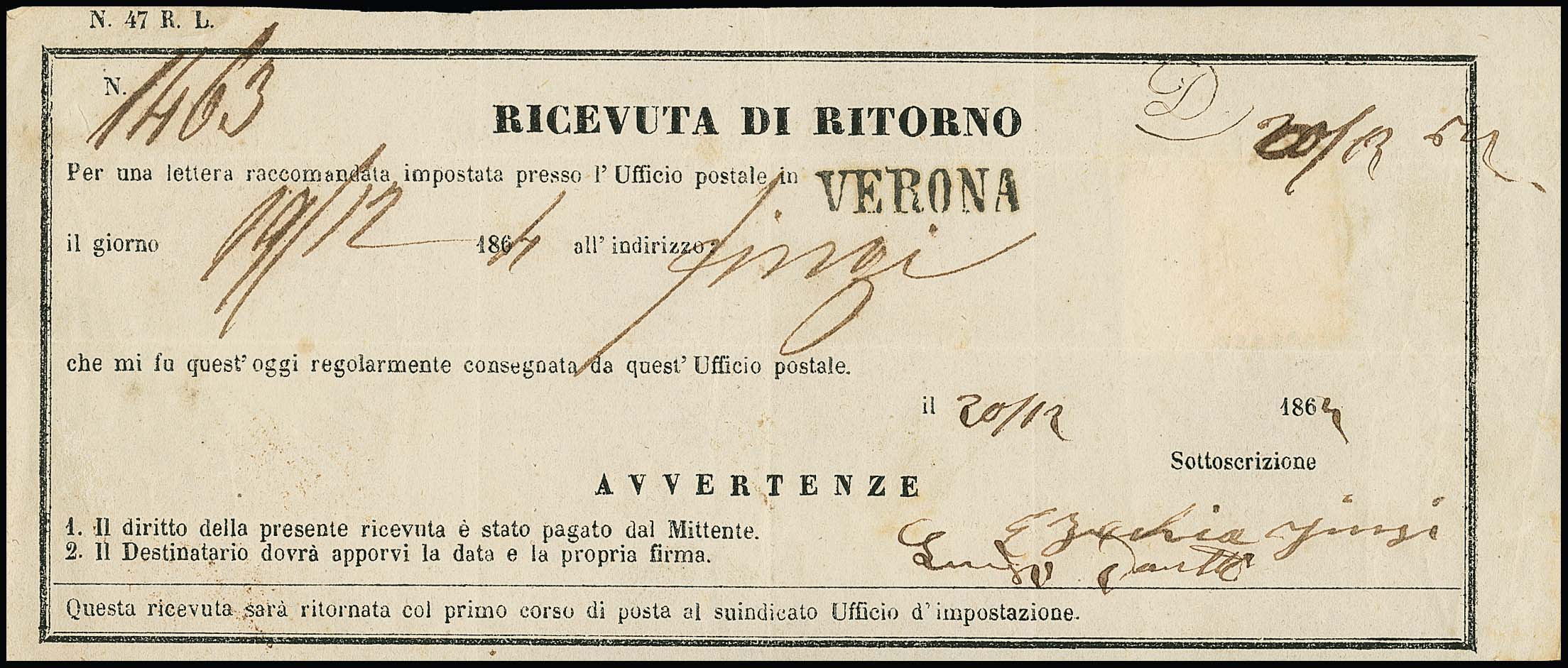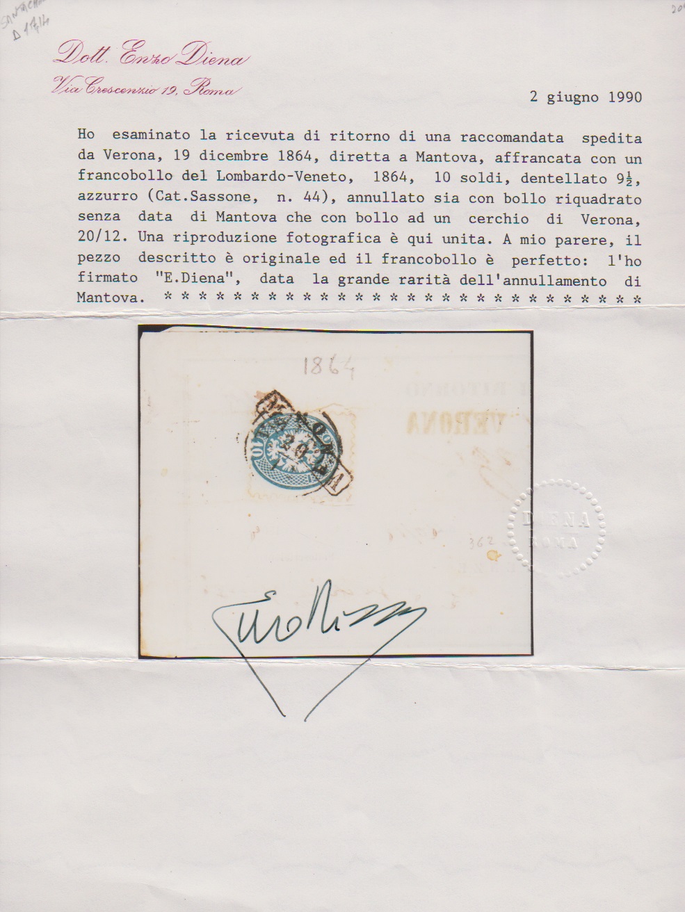 10 Sld. blau rückseitig auf Retour-Recepisse 1864 mit seltener Entwertung durch K1 "Verona" und Ra1 "Mantova" (Müller 141c, 500 P.), Attest Diena