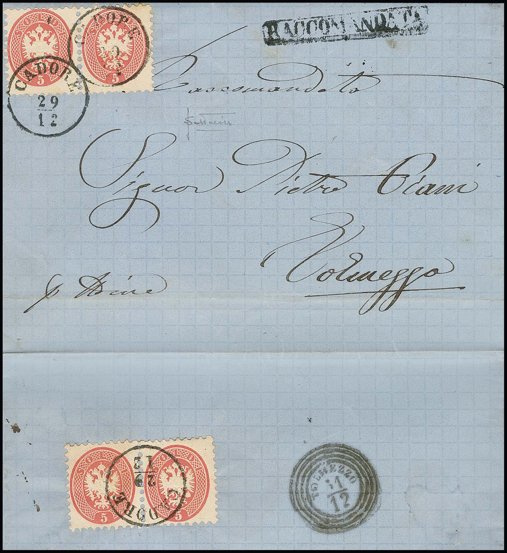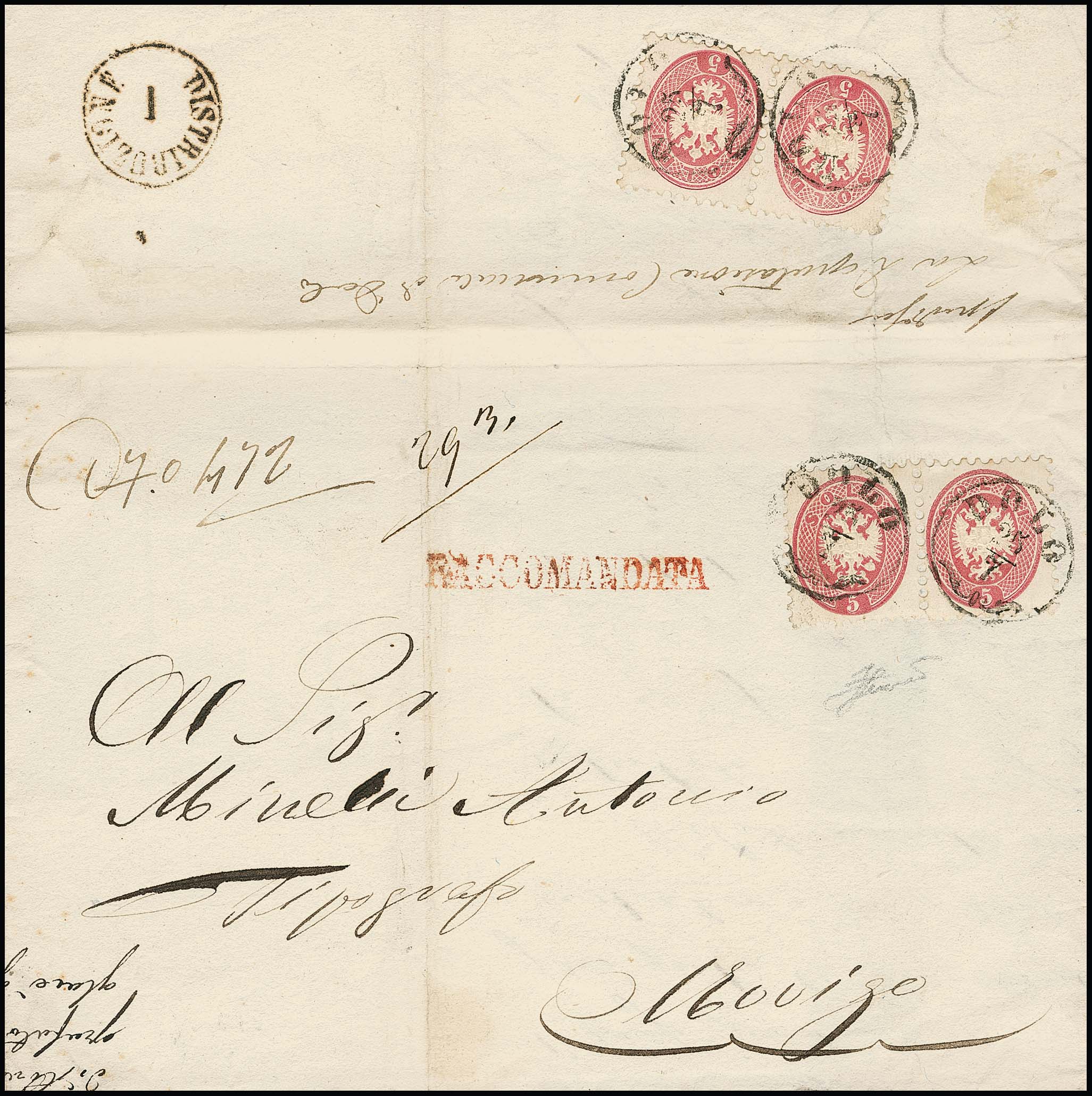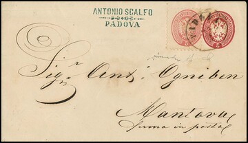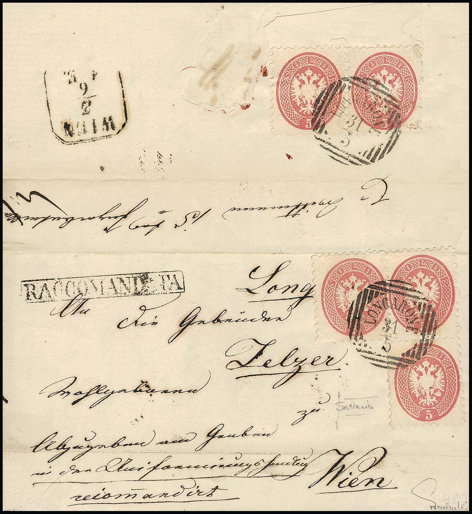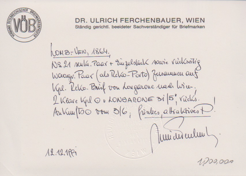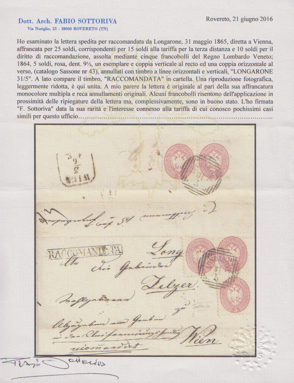 5 Sld. rosa per fünf (ein Paar rückseitig) auf dekorativem Recobrief mit Zier-K1 "Longarone" 1865 nach Wien, ein Wert kleine Eckzahn-Beanstandung, tadellose Fotoexpertise Ferchenbauer sowie Attest Sottoriva