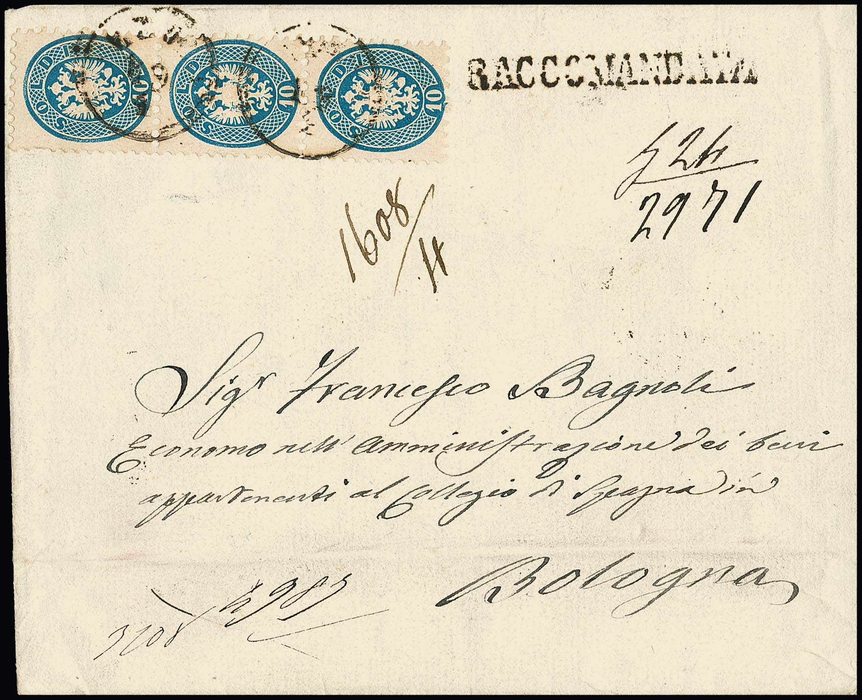 10 Sld. blau im senkrechten Dreierstreifen (ein Wert ein kurzes Zähnchen) auf gef. Recobrief nach Bologna
