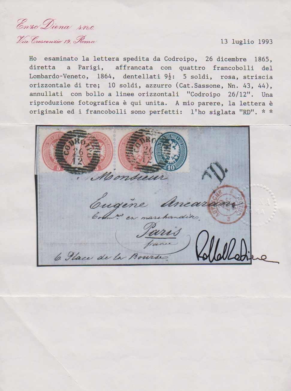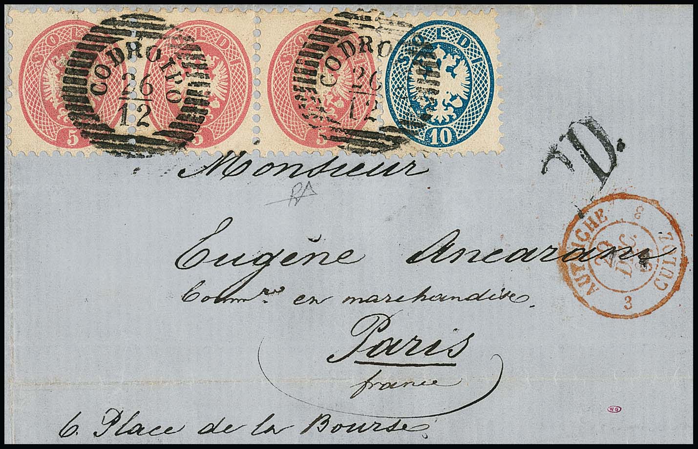5 Sld. rosa im Dreierstreifen, nebst 10 Sld. blau, auf Kabinettbrief 1865 mit Einkreiser "Codropio" nach Paris, Müller 78c, Attest Diena