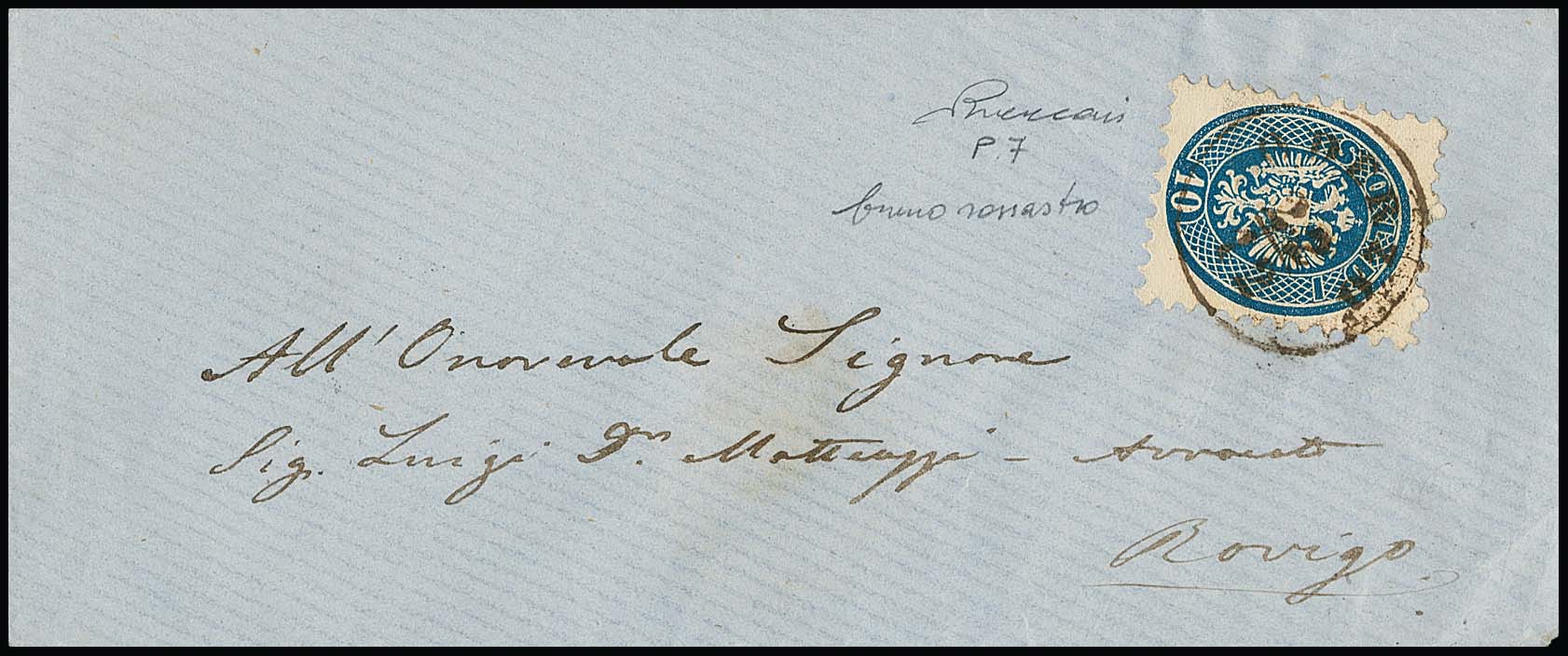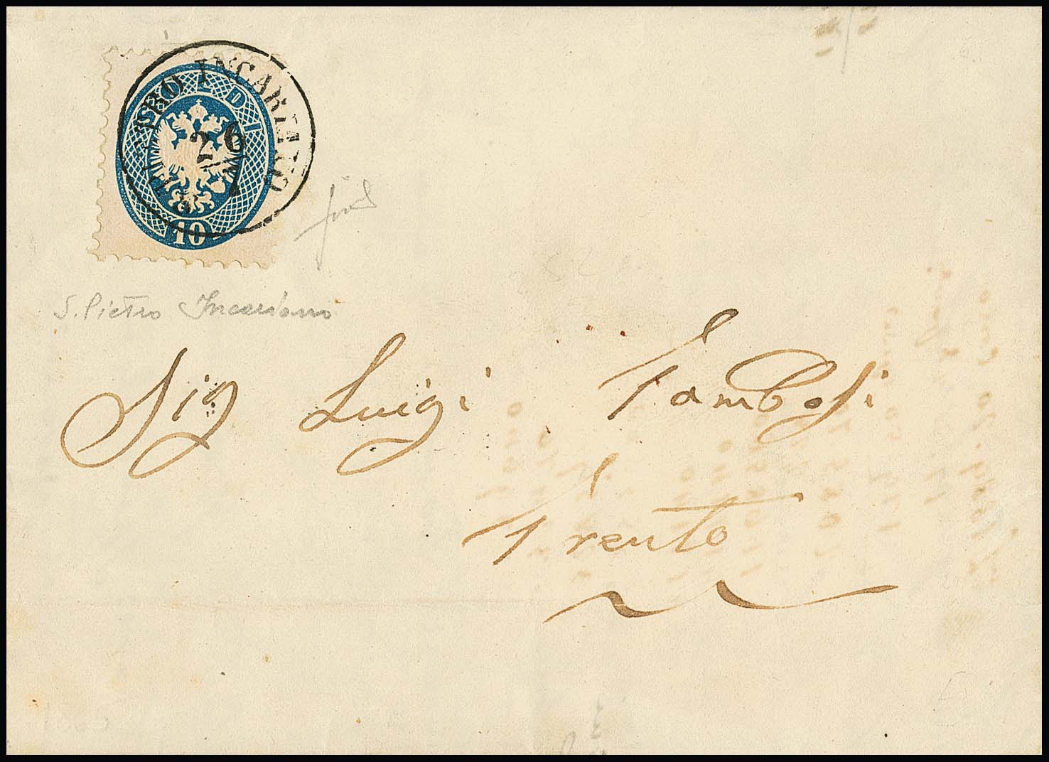 10 Sld. blau, noch vollzähnig, auf Prachtbrief 1865 mit seltenem K1 "S. Pietro Incarino" (Müller 220b), div. Sign.