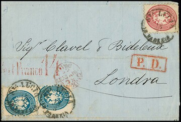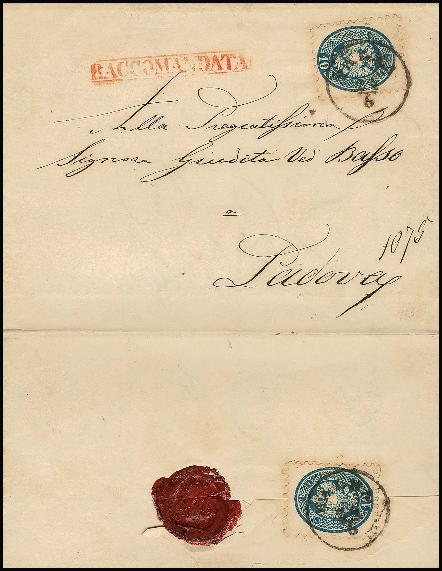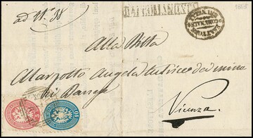 10 Sld. blau, zwei etwas getönte Exemplare vorder- und rückseitig auf Einschreibebrief 1864 mit seltenem K1 "Palma" nach Padua