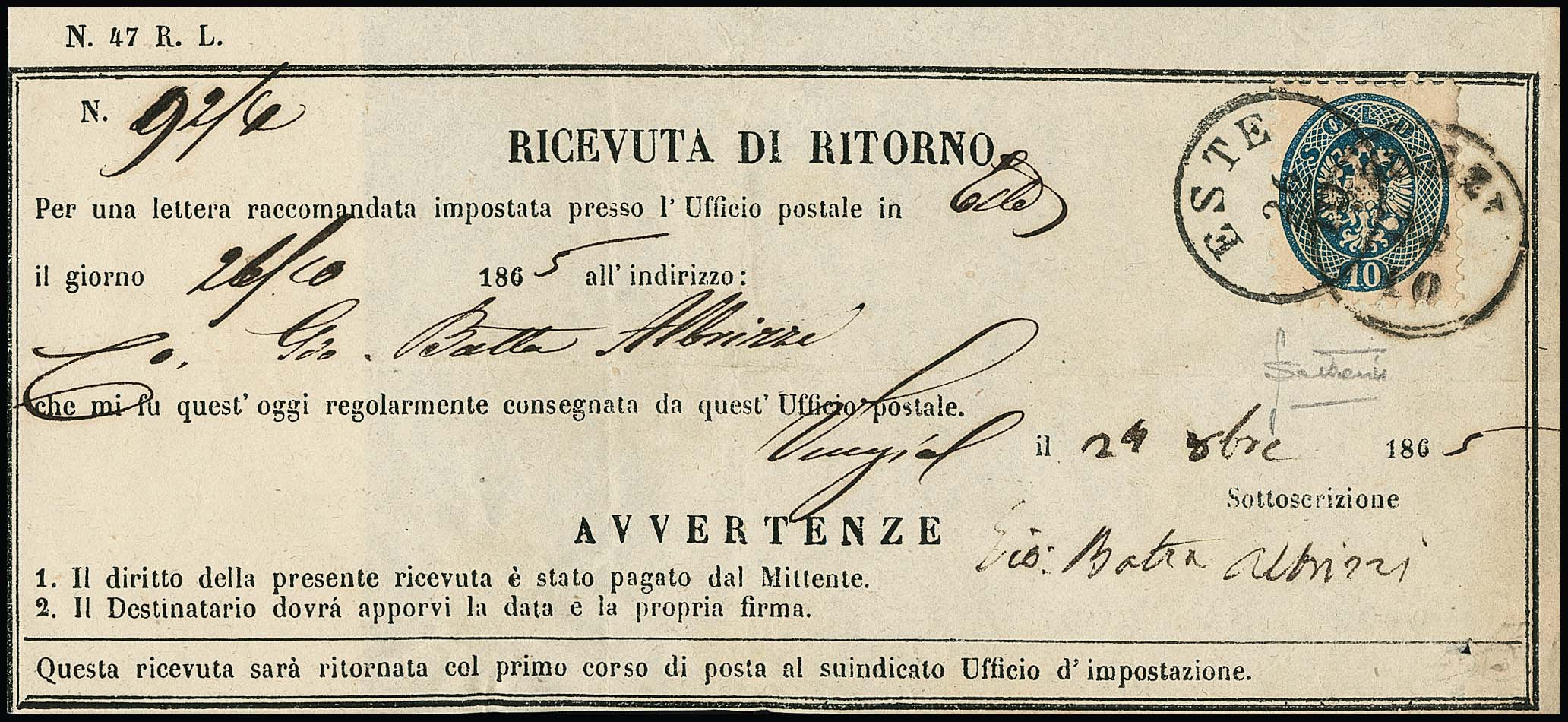 10 Sld. blau, Prachtstück auf gef. Retour-Recepisse 1865 mit Doppelentwertung durch K1 "Este" und "Venezia", Müller 98c, sign. Sottoriva