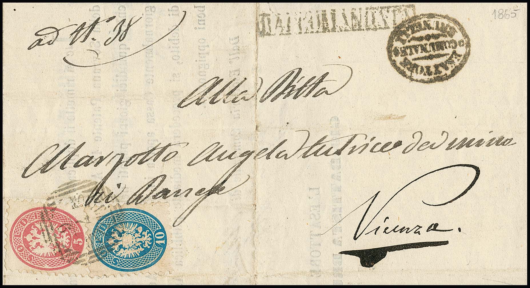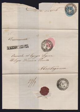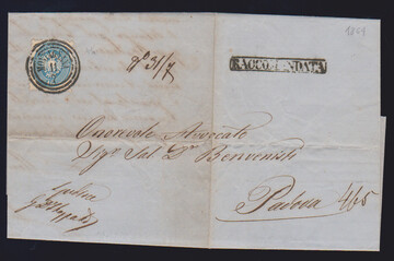 5 Sld. rosa als Porto vorderseitig, rückseitig 10 Sld. blau als Recogebühr, auf Recobrief mit Dreiringstempel "Lendinara"