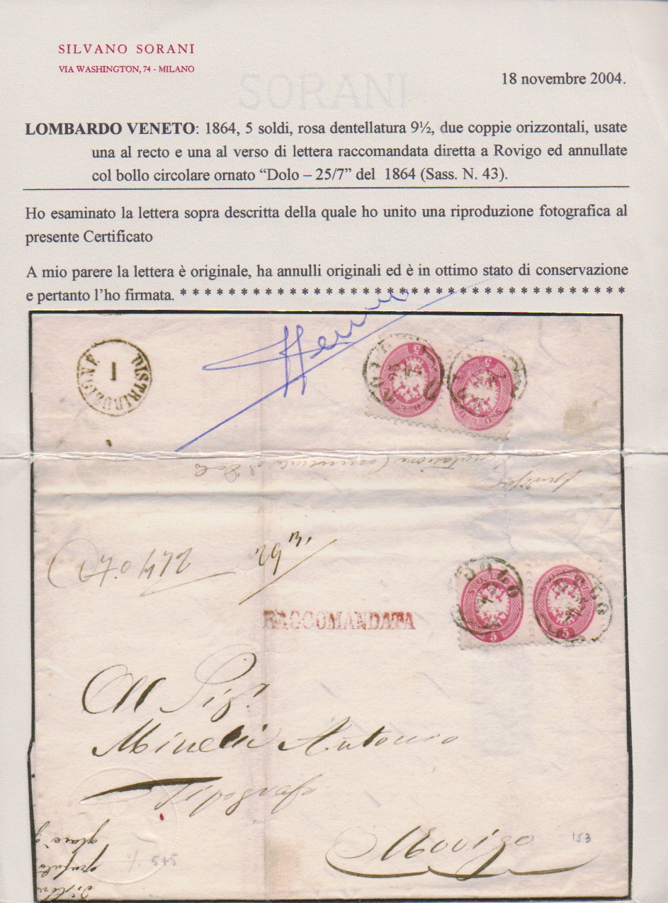 5 Sld. rosa, zwei Pracht-Paare vs./rs. auf Recobrief (Falte ausserhalb) mit K1 "Dolo" 1864 nach Rovigo, Attest Sorani