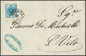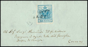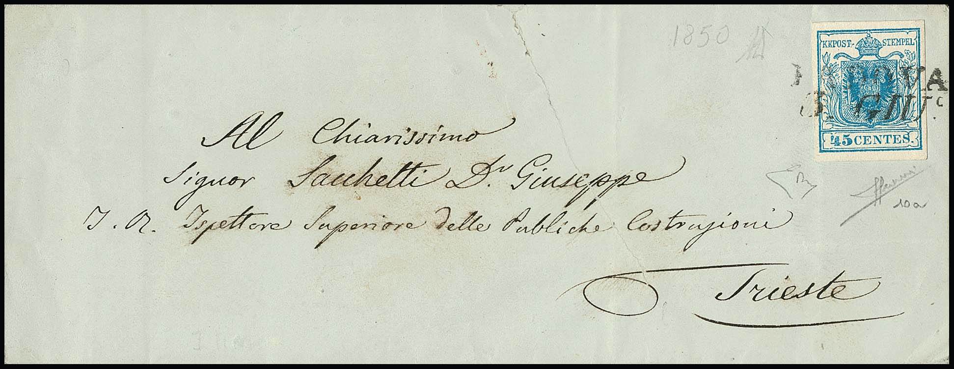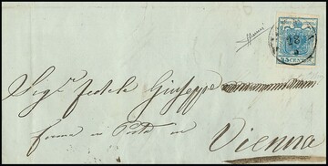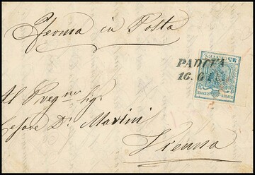 45 C. hellblau, Handpapier, mit breitem linkem Bogenrand auf frühem Prachtbrief mit blauem L2 "Padova" vom 16. Juni 1850 (und leichtem Rötelkreuz), Inhalt aus Mai 1850, gelaufen an eine Postlageradresse in Wien