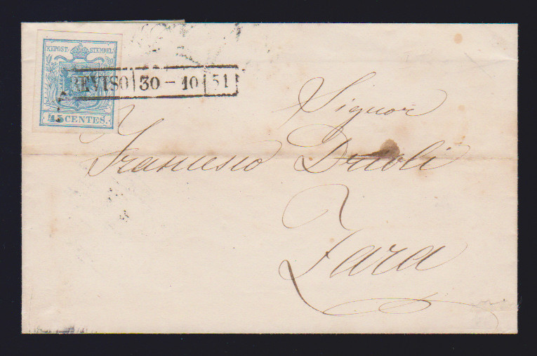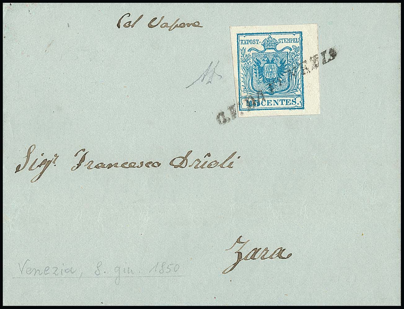 45 C. blau, Handpapier, breitrandig vom rechten Bogenrand auf Kabinettbrief mit L1 "C.V. da Venezia", hs. "Col Vapore", nach Zara, früher und sehr schöner Brief vom 8. Juni 1850, sign. Diena mit Attestkopie