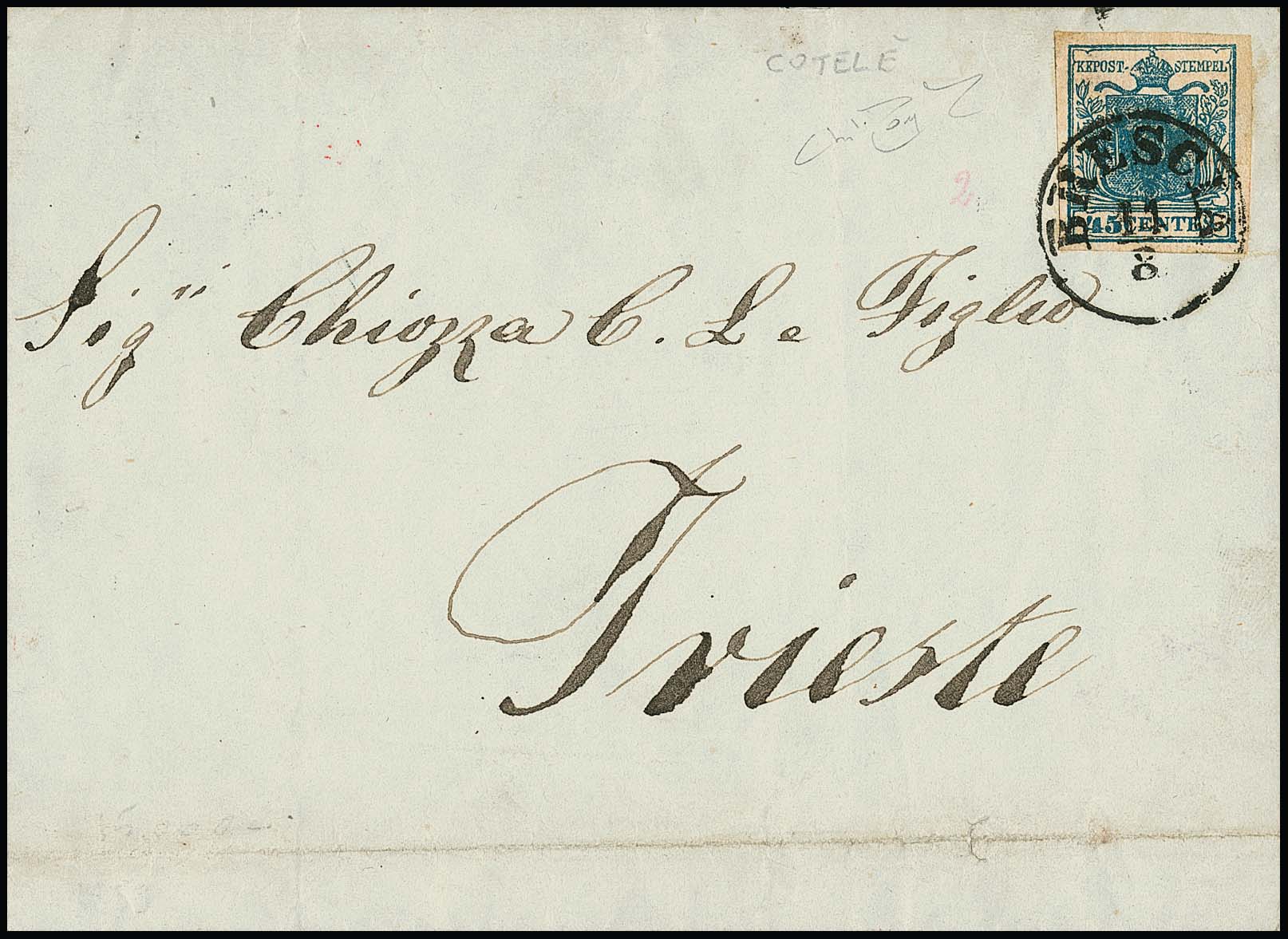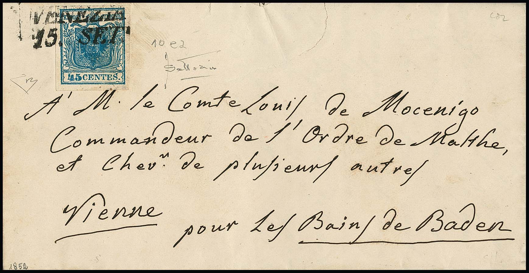 45 C. blau, Handpapier, Kabinettstück mit L2 "Venezia" auf Brief (Randrißchen) an den Grafen von Mocenigo in Baden bei Wien. Die Marke in seltener Farbnuance "azzuro ardesia scurissimo" (Sass. 10ea), Atteste Diena, Sottoriva