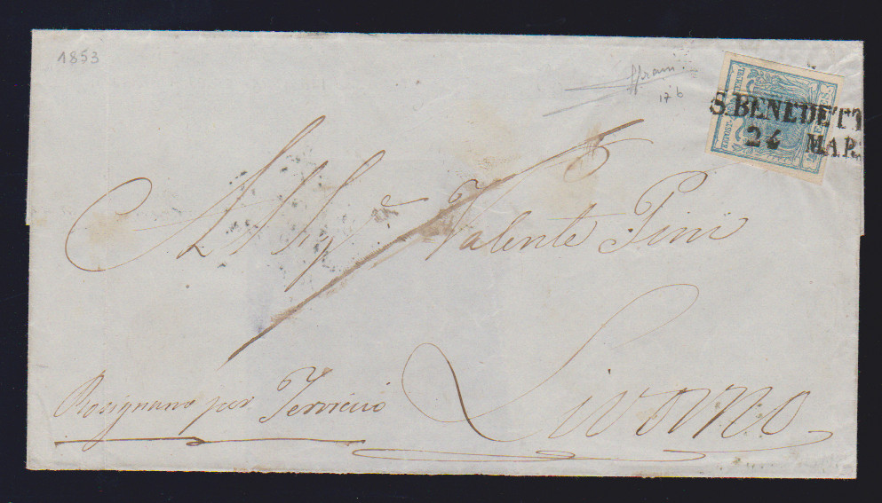45 C. blau, Handpapier, perfektes Exemplar auf Faltbrief mit L2 "S. Benedetto", sign. mit Attest Sorani