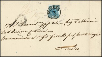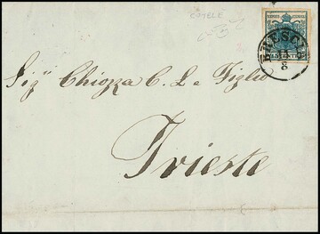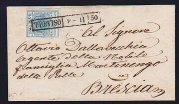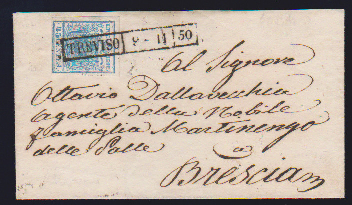 45 C. blau, Handpapier, Kabinettstück auf Brief (Einriß ausserhalb) mit früher Entwertung durch L2 "Padova" vom 3. Juni (1850), sign. Sorani und Diena mit Attest