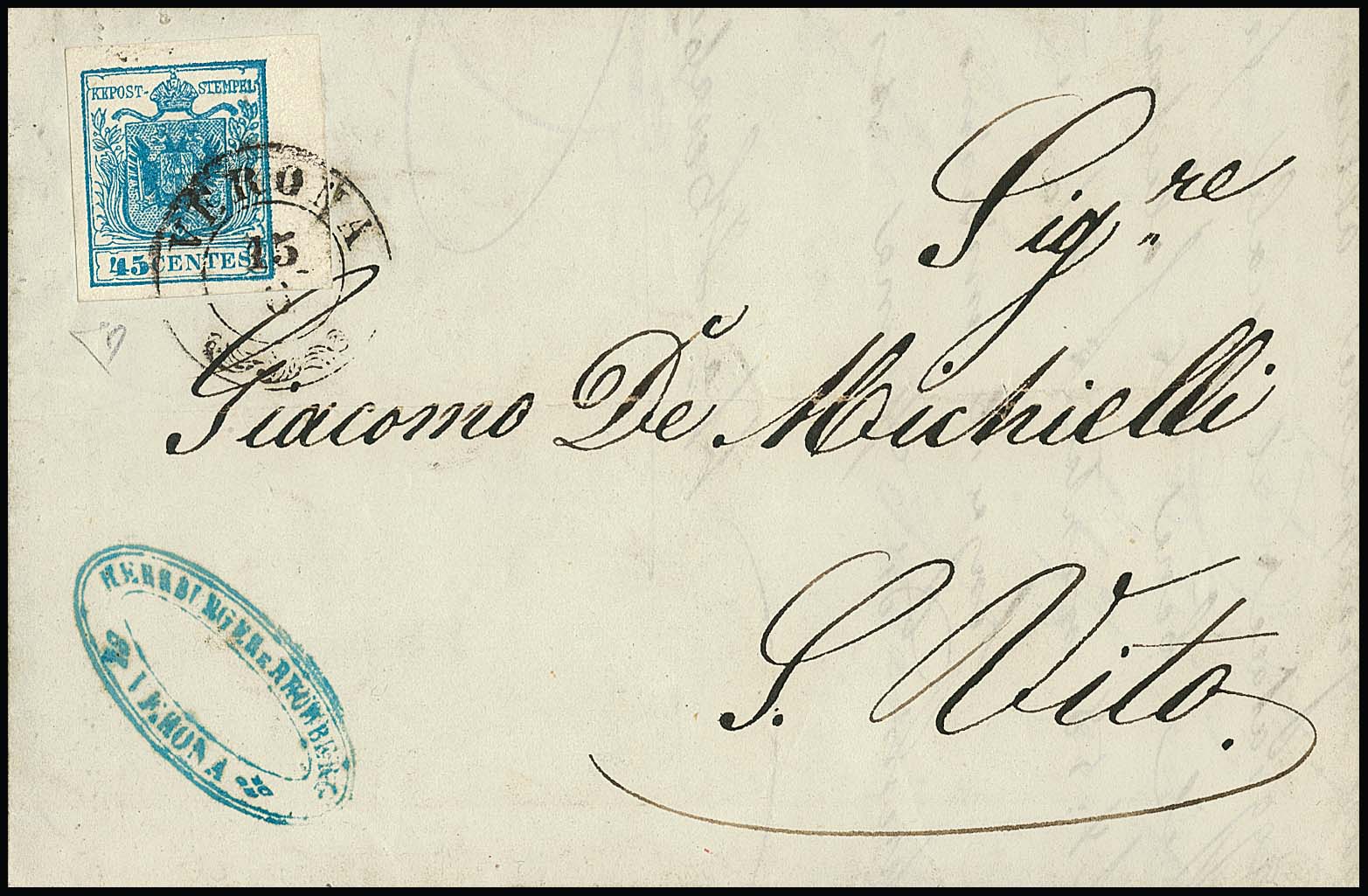 45 C. blau, Handpapier, Erstauflage, Kabinettstück mit breitem rechtem Bogenrand auf frühem Faltbrief mit K2 "Verona" vom 15.6.1850, sign. Diena