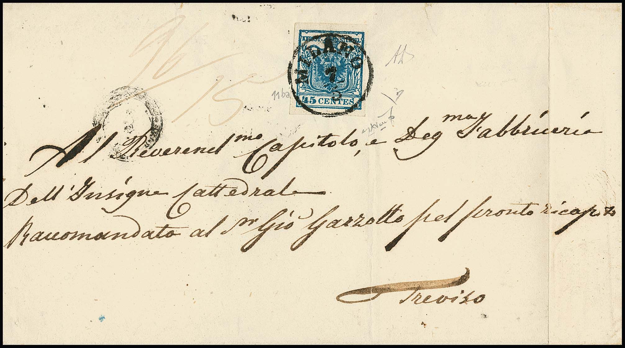 45 C. blau, Handpapier, Kabinettstück mit zentrischem K1 "Milano" auf nachtaxiertem Doppelbrief nach Treviso, Brief Faltspuren ausserhalb, Attest Avanzo