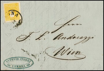 2 Sld. gelb, Type I, auf Kabinett-Drucksache 1858 mit K1 "Verona" nach Wien, Attest Diena. Mi. 1300,-