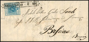 45 C. blau, Handpapier, links oben "Lupenrand", auf kleinem Prachtbriefchen mit besserem Stab-Ra1 "Belluno" v. 11.9.1850, Attest Sottoriva, Müller 30a