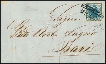 45 C. blau, seltenes geripptes Handpapier und zusätzlich deutlicher Plattenfehler "Randlinie unten mehrfach gebrochen", Kabinettstück mit L2 "Venezia" auf nachtaxiertem Auslandsbrief (kl. Papierausfälle) nach Bari/Italien, rs. Transit-L2 via Kirchenstaat. Attest Sorani. Mi. 650,- + PF
