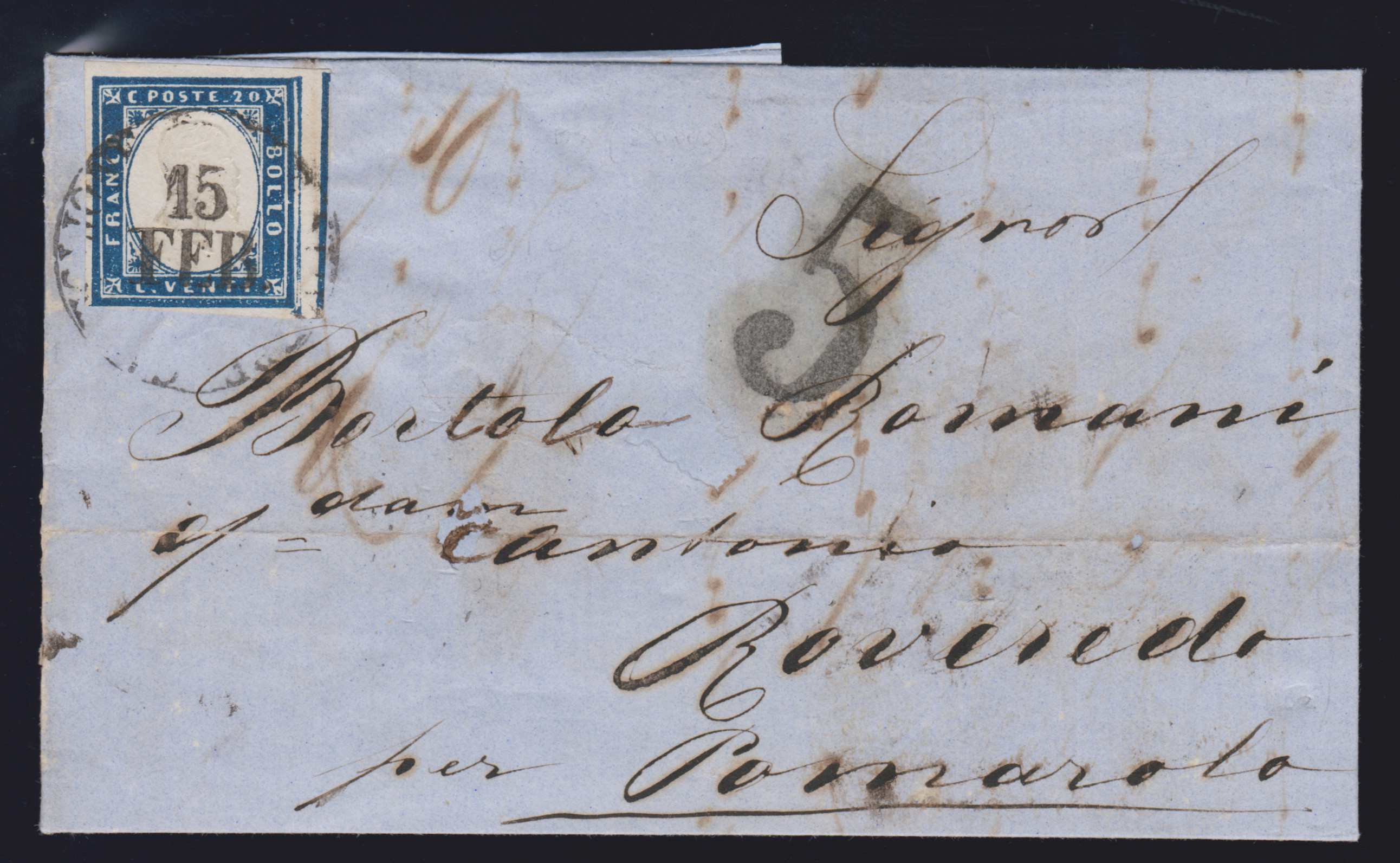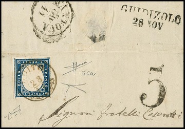 20 C. blau auf Prachtbrief von Castiglione, 15.2.1860, nach Roveredo, Taxstempel "5", weil wegen des Krieges (30.4.59-14.5.62) Postaustausch nur franco Grenze möglich war
