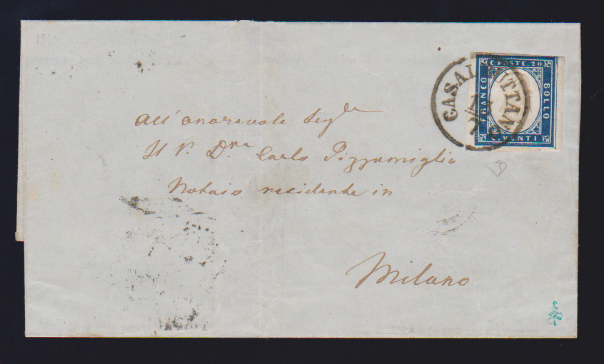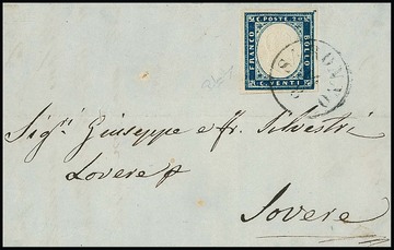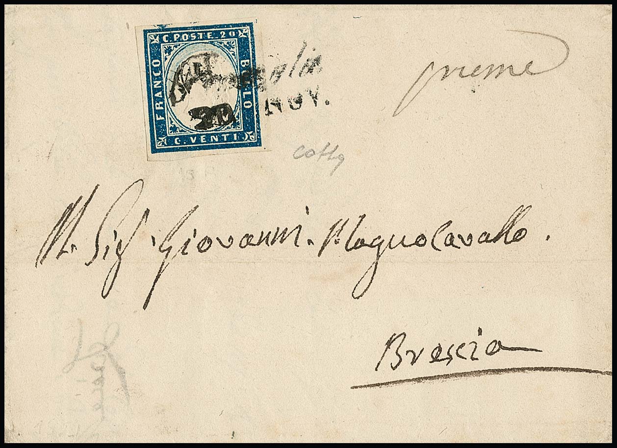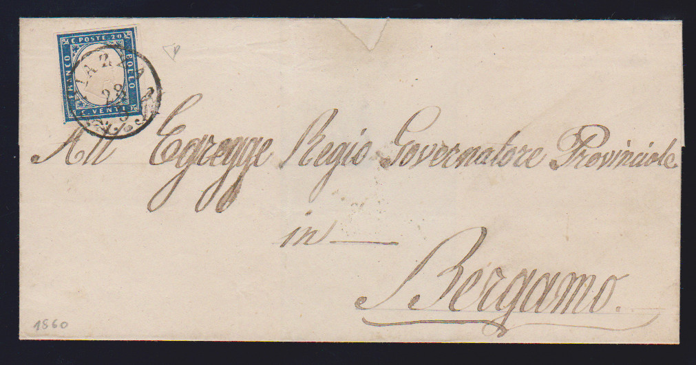 20 C. blau (oben etwas "Lupenrand") auf Prachtbrief vom 13.7.1860 mit nachverw. Lombardei-K1 "Casalbuttano", ex Provera, sign. Diena