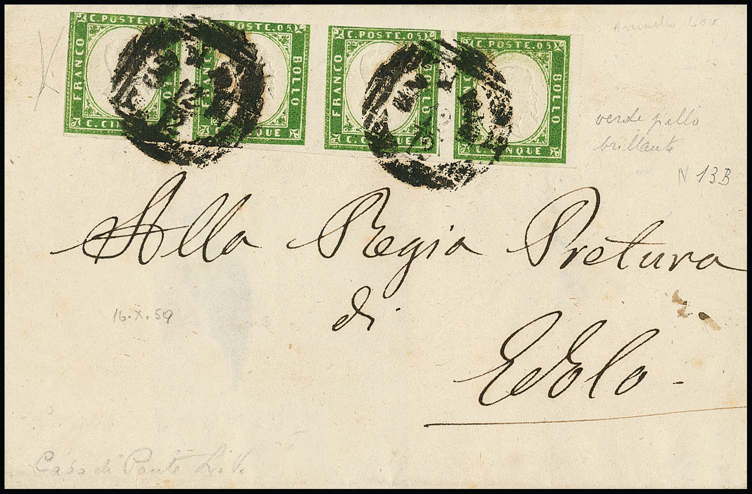 5 C. olivgrün, zweite Auflage (Sassone 13B), Viererstreifen mit deutlicher Klischeeverschiebung, dadurch zwangsläufig berührt, auf Faltbrief vom 12. Dez. 1859 mit nachverwendetem seltenem Lombardei-Einkreiser "Capo di Ponte", sign. Bottacchi mit Attest (Mi. lose gest. 1000,- + Stempel)