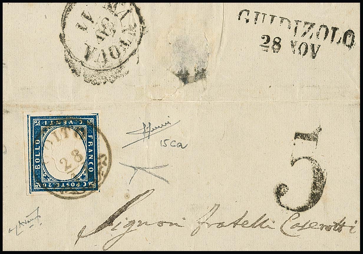 20 C. blau, Kabinettstück auf großem Briefstück mit seltenem braunschwarzem Lombardei-K1 "Goito" und nebengesetztem Taxstempel "5", sowie rs. Transitstempeln, Atteste Sorani und Avanzo