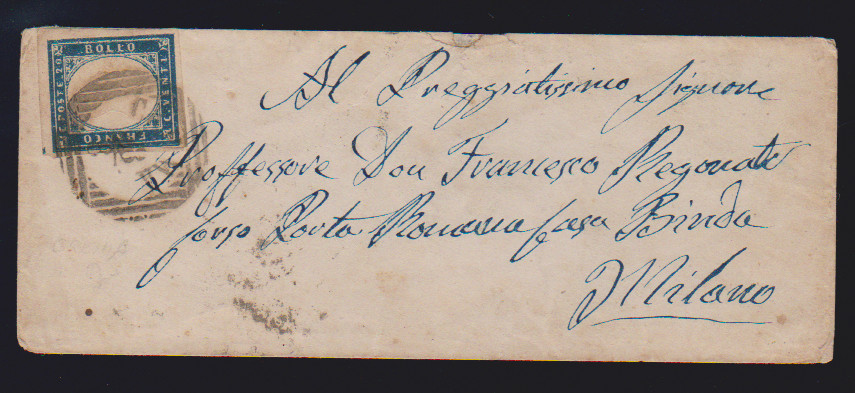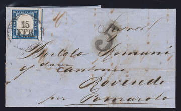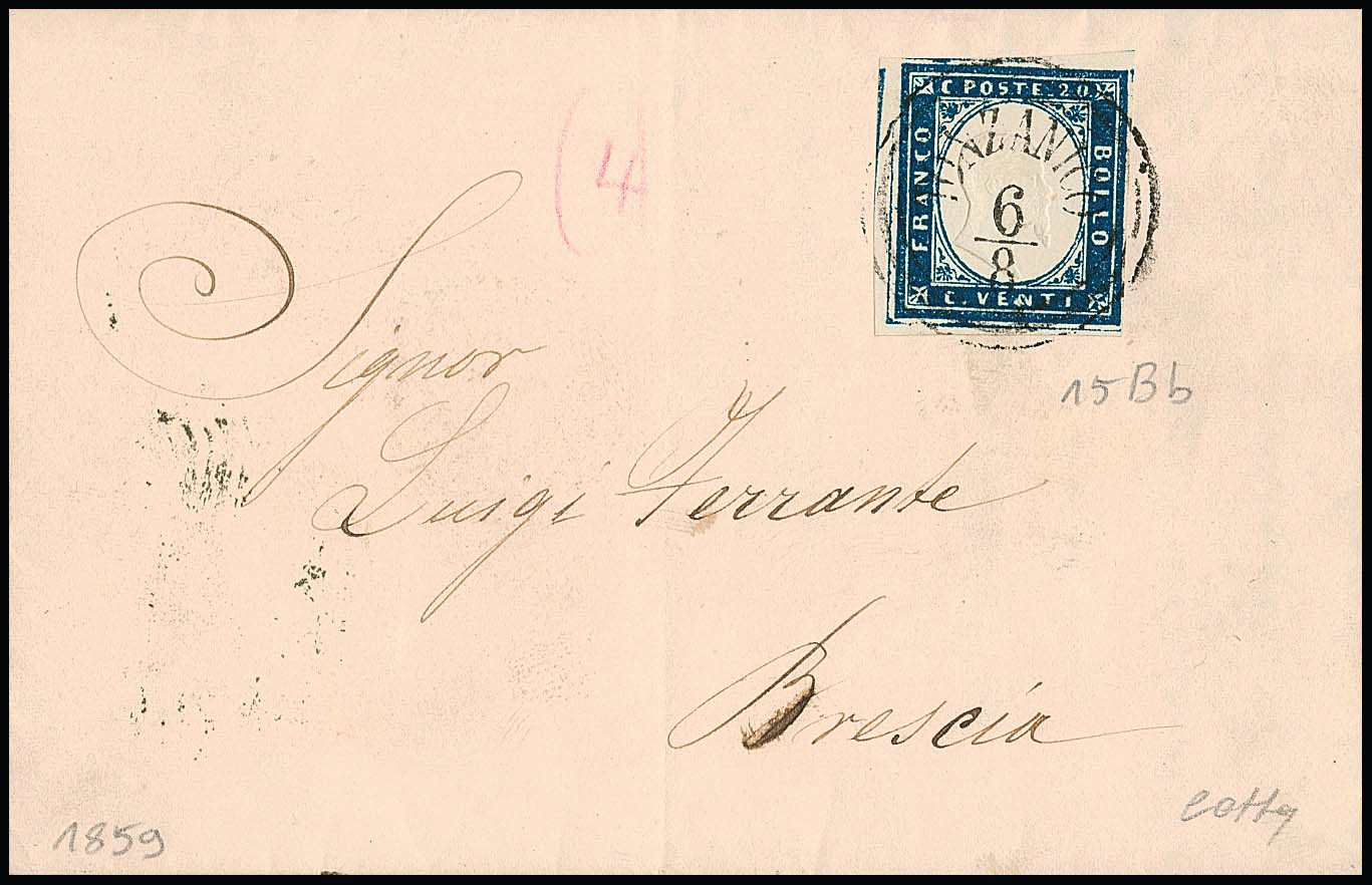20 C. blau, Kabinettstück auf kleinem Briefchen 1859 mit nachverw. Lombardei-K1 "Saronno"