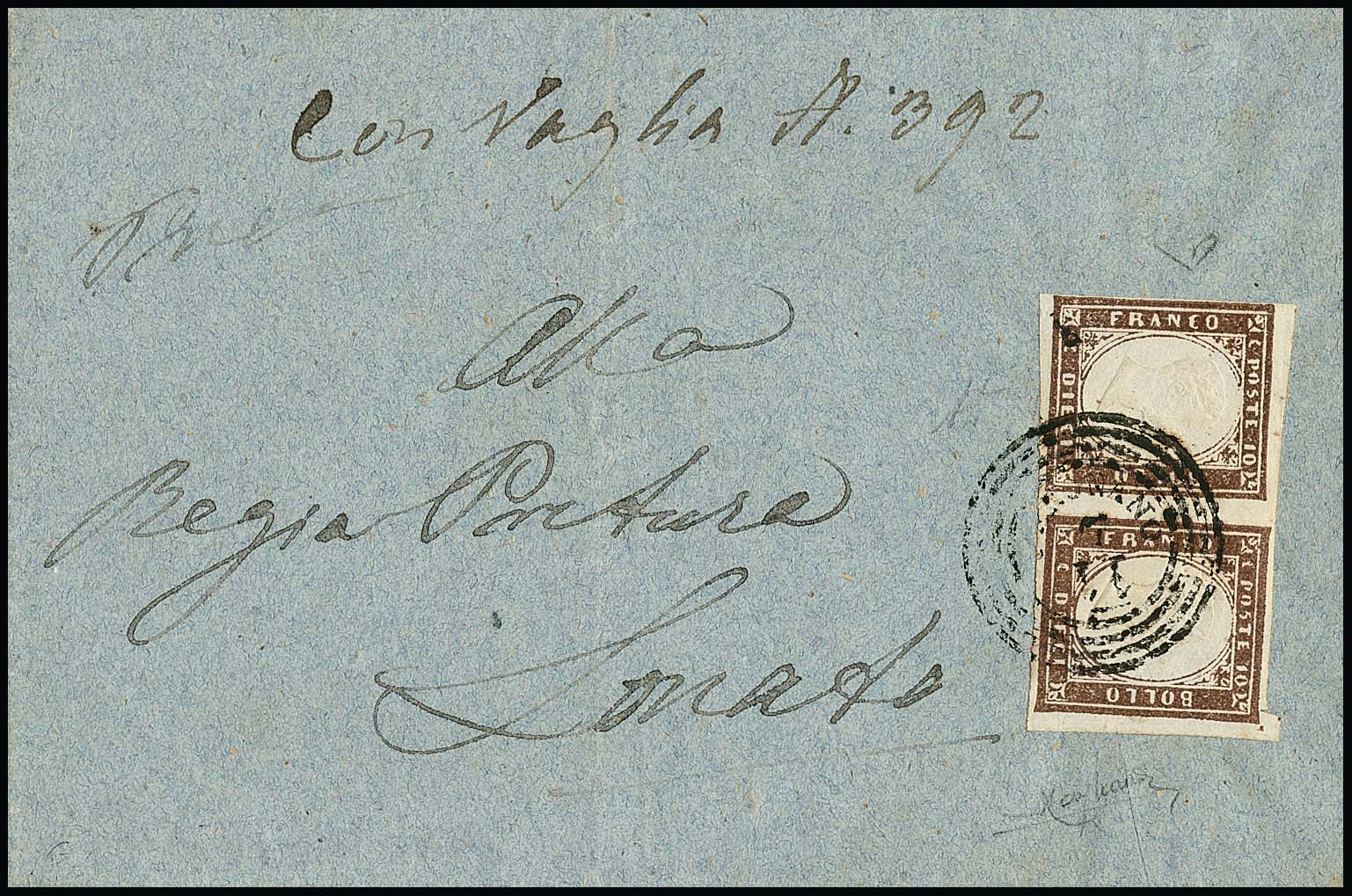 10 C. braungrau im Paar auf Prachtbrief mit seltenem nachverw. Lombardei-Dreiringstempel "Gargnano" mit kopfstehendem Datum. Attest Raybaudi. Mi. für loses gest. Paar schon 520,- + Stempel
