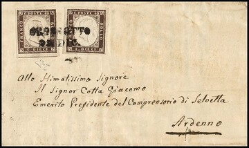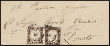 10 C. dunkelbraun, zwei Prachtstücke auf leicht unfrischem Brief 1859 mit seltener Lombardei-Venetien-Entwertung durch L2 "Grossotto" (Müller 115a) nach Ardenno. Attest Diena "perfetti"