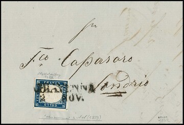 20 C. blau auf Kabinettbrief mit seltenem nachverwendetem Lombardei-L2 "Chiavenna" vom 20. Nov. 1859, sign. Bolaffi
