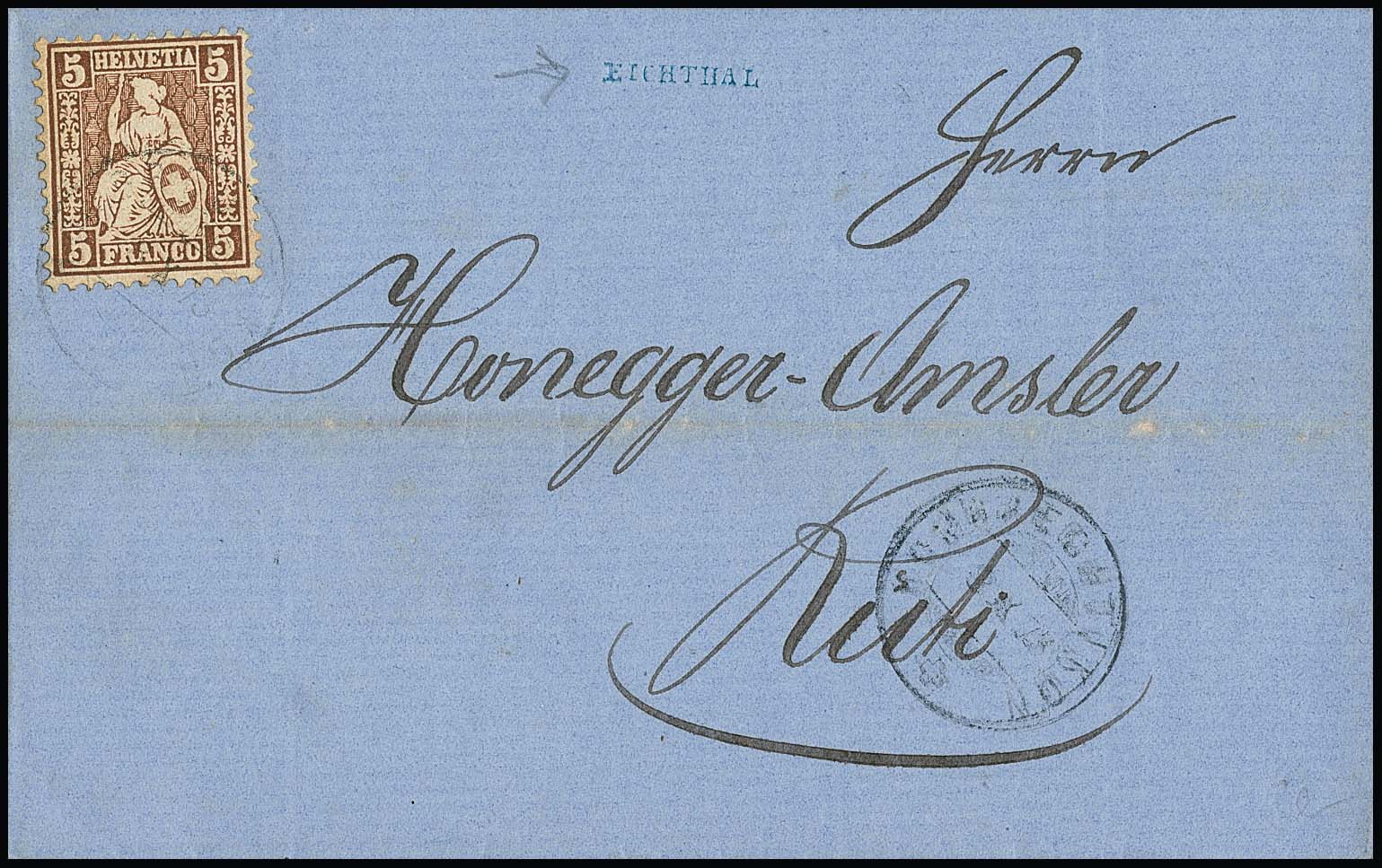5 C. braun auf mittig gef. Prachtbrief 1873 mit seltenem kleinem blauem L1 "Eichthal" als Aufgabestempel und Marke mit K2 des übergeordneten Postamts entwertet