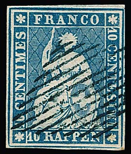 10 Rp. blau, Münchener Druck, weißrandiges gestempeltes Kabinettstück, Attest Trüssel. Mi. 550,-
