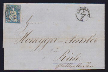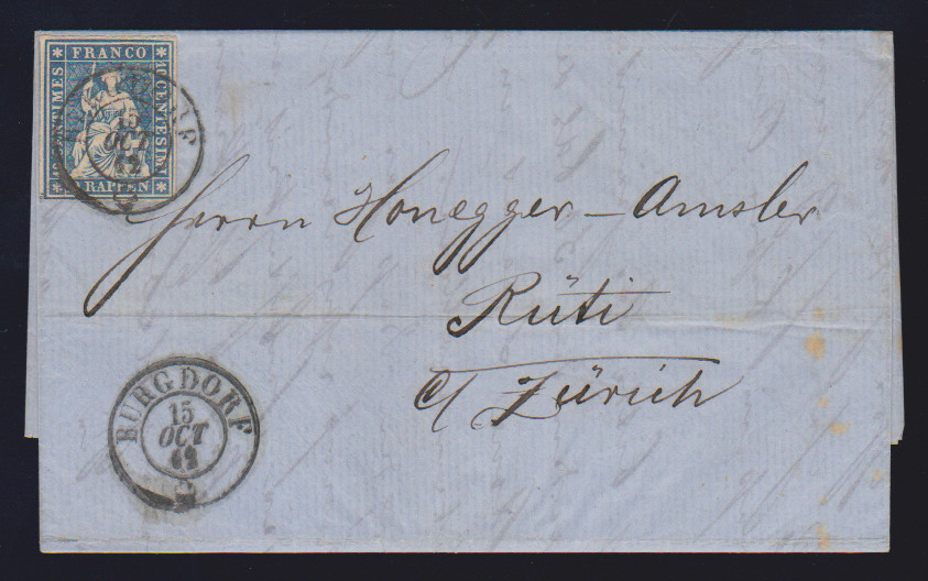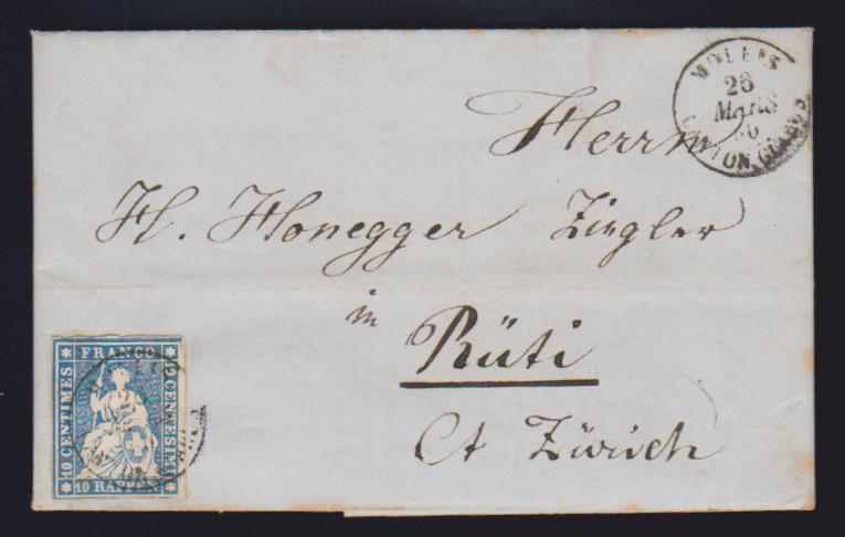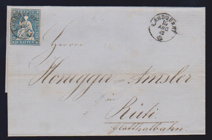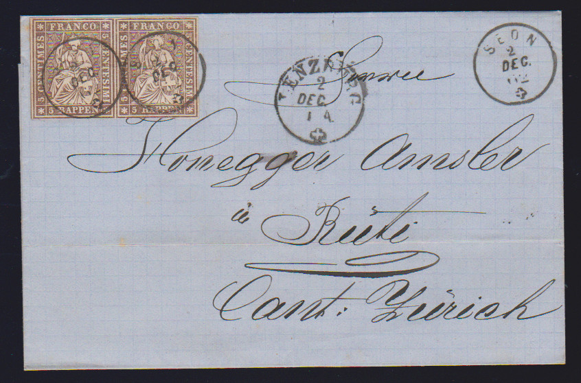 10 Rp. blau, Strubel, versch. Auflagen, fünf Briefe, alle Marken ausgesucht voll- bis meist breitrandig, teils Nebenmarken, sowie Paar 5 Rp. braun, alle sechs aus einer Korrespondenz 1860-62 nach Rüti bei Zürich, u.a. kleine K1 "Seon", "Landquart"