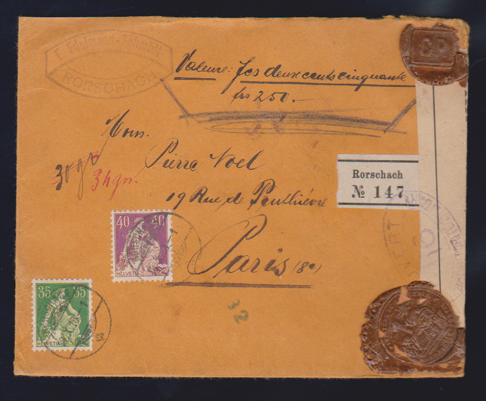 35 und 40 C. Sitzende Helvetia auf Auslands-Zensur-Wertbrief von Rorschach 1918 nach Paris