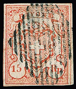 15 Rp. rosarot, gestempeltes Kabinettstück, Attest Rellstab. Mi. 650,-