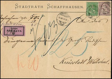 25 C. grün und 50 C. violett auf gef. Nachnahmebrief im Grenzrayon von Schaffhausen 1878 nach Waldshut mit violettem Walshuter "Auslagen"-Zettel
