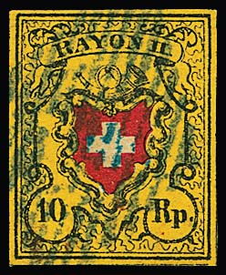10 Rp. schw./rot/rötlichgelb, Stein B, Type 13, Kabinettstück mit Spuren der Kreuzeinfassung (Zumstein Nr. 16II.1.02), Fotoexp. Marchand. Mi. 220,- +