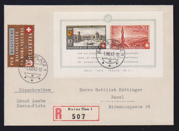 Pro Juventute-Block, nebst Paar 5 + 5 C., auf portoger. R-Brief aus Zürich 1941. Mi. 550,-