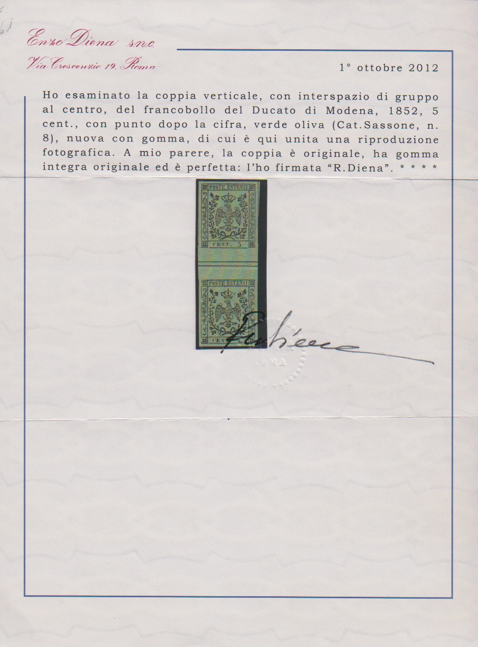 5 C. schw./grün, Type I mit Punkt, ungebrauchtes senkrechtes Zwischenstegpaar (typische Faltspur im Steg), untere Marke postfrisch. Attest Diena