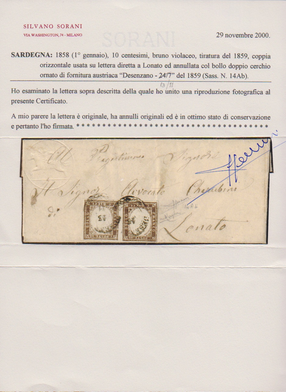 10 C. dunkelbraun im waagerechten Paar mit deutlicher Klischeeverschiebung (dadurch linke Marke oben links etwas berührt) auf Brief 1859 mit seltener Entwertung durch nachverw. Lombardei-K2 "Desenzano" nach Lonato (Sassone 14AB), Attest Sorani