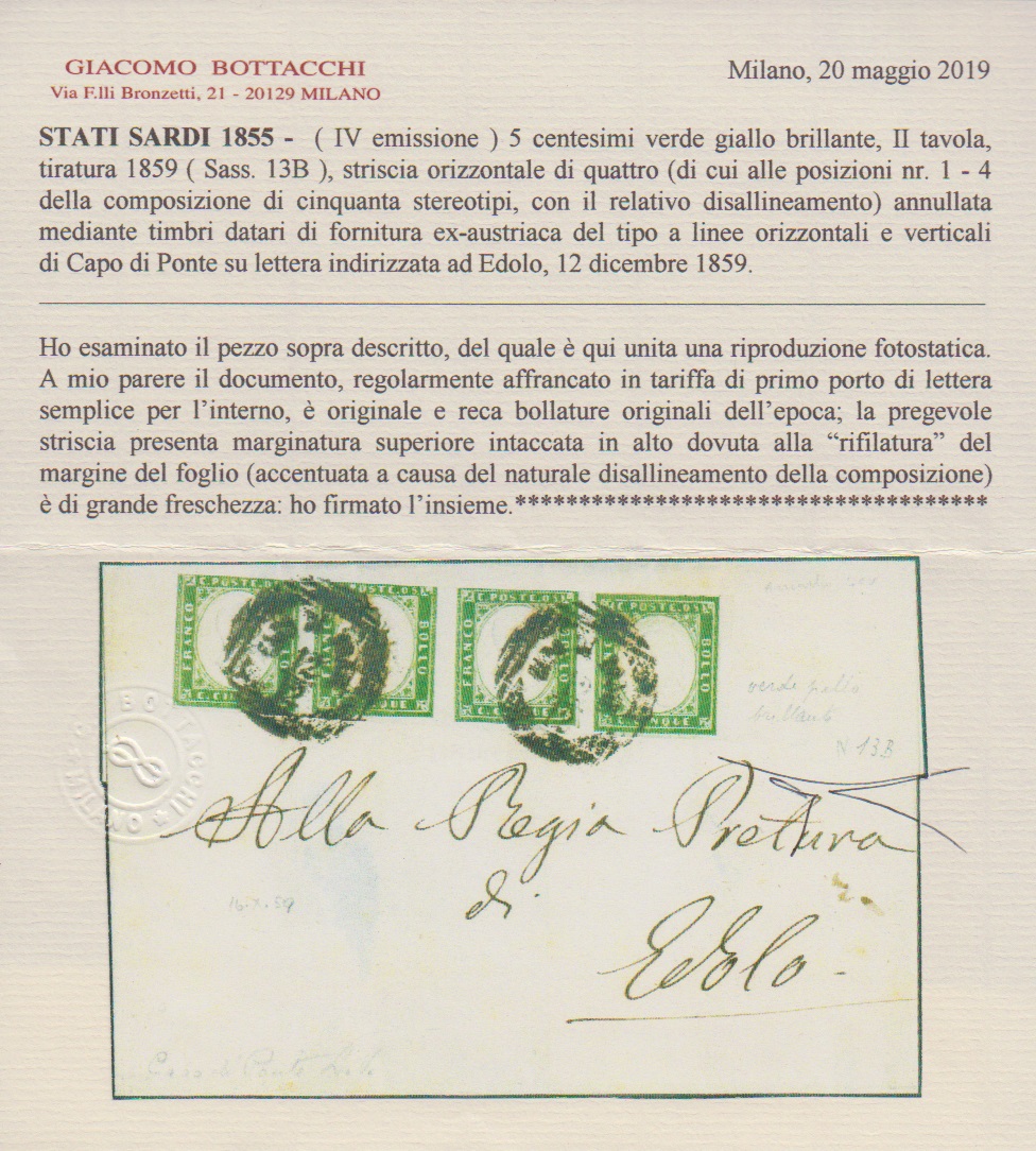 5 C. olivgrün, zweite Auflage (Sassone 13B), Viererstreifen mit deutlicher Klischeeverschiebung, dadurch zwangsläufig berührt, auf Faltbrief vom 12. Dez. 1859 mit nachverwendetem seltenem Lombardei-Einkreiser "Capo di Ponte", sign. Bottacchi mit Attest (Mi. lose gest. 1000,- + Stempel)