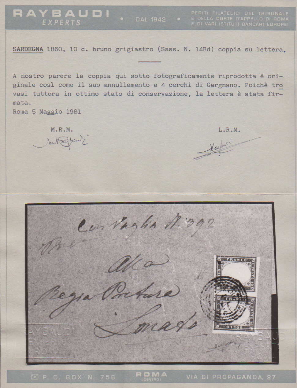 10 C. braungrau im Paar auf Prachtbrief mit seltenem nachverw. Lombardei-Dreiringstempel "Gargnano" mit kopfstehendem Datum. Attest Raybaudi. Mi. für loses gest. Paar schon 520,- + Stempel