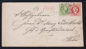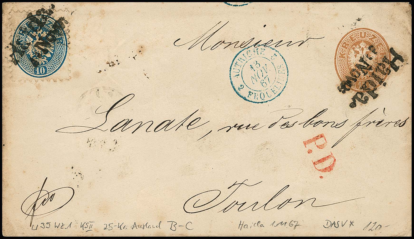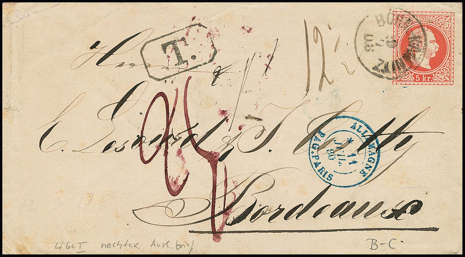 5 Kr. rosa per zwei, bzw. 10 Kr. blau, auf zwei Ganzsachen 15 Kr. braun aus gleicher Korrespondenz mit L2 "Haida" 1867 nach Toulon/Frankreich, sowie unterfrankierte Ganzsache 5 Kr. Franz Joseph 1888 nach Bordeaux mit Nachtaxe, kleine Fehler